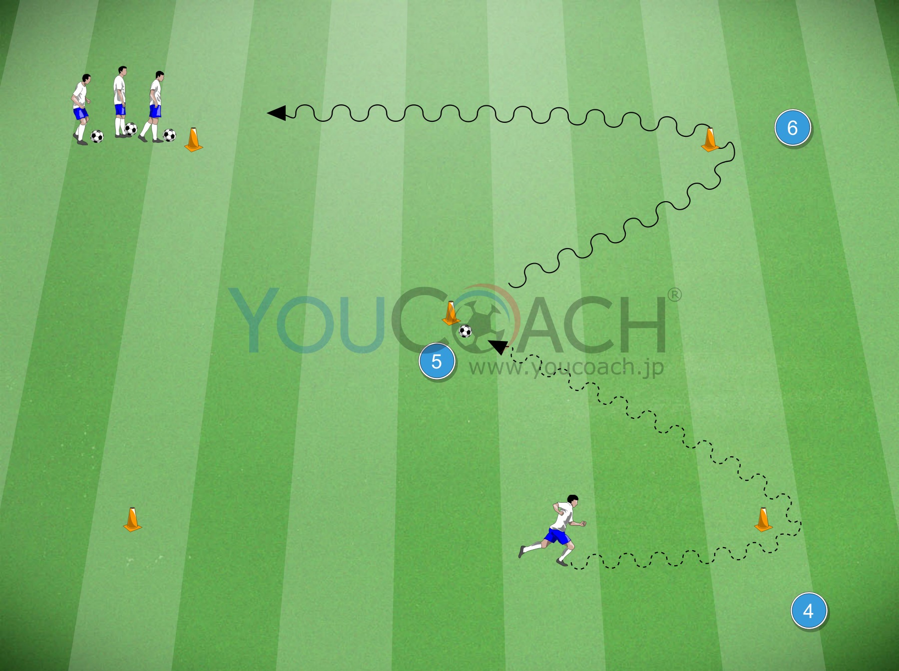 - トレーニングは連続して行い、前のプレイヤーがコーン4に到着したタイミングで次のプレーヤーがスタートします。