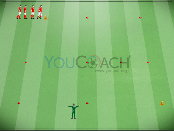 プレーエリア内にマーカーを使用したフィジカルサーキットを作っていきます。スタートとゴール地点にはコーンを1個ずつ配置。スタート位置にはプレイヤー1列になってスタンバイ。