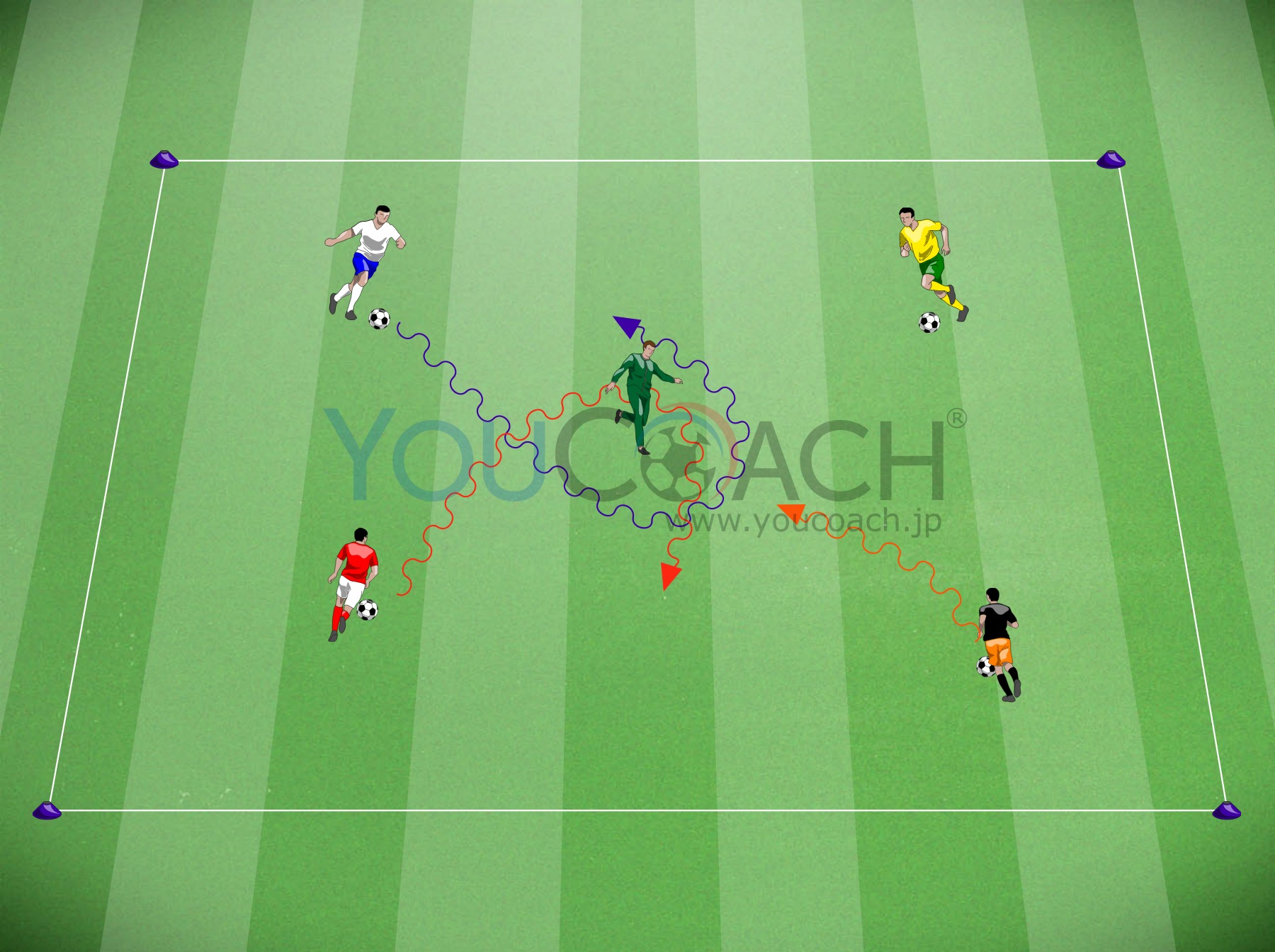 4人のプレイヤーが、それぞれ足で1つずつボールを持って、順番にグリッドのコーナーからスタートする。