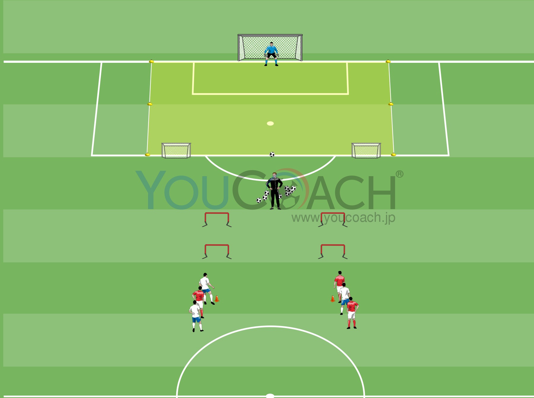 もしGKがセービングした場合、ディフェンスとGKが仲間となり、2対1の状況に変わります。攻撃方向はミニゴール2ヶ所のうちどちらか1つ。ボールが外に出るかゴール(大ゴールかミニゴール)が決まるまでプレーは継続します。プレーを終えたら、コーチはペナルティエリアライン上にボールを1つ置き、次のペアの勝負の準備。2組目も同じくハードルを通過後、緑ゾーンに残った味方と共に2対2開始。