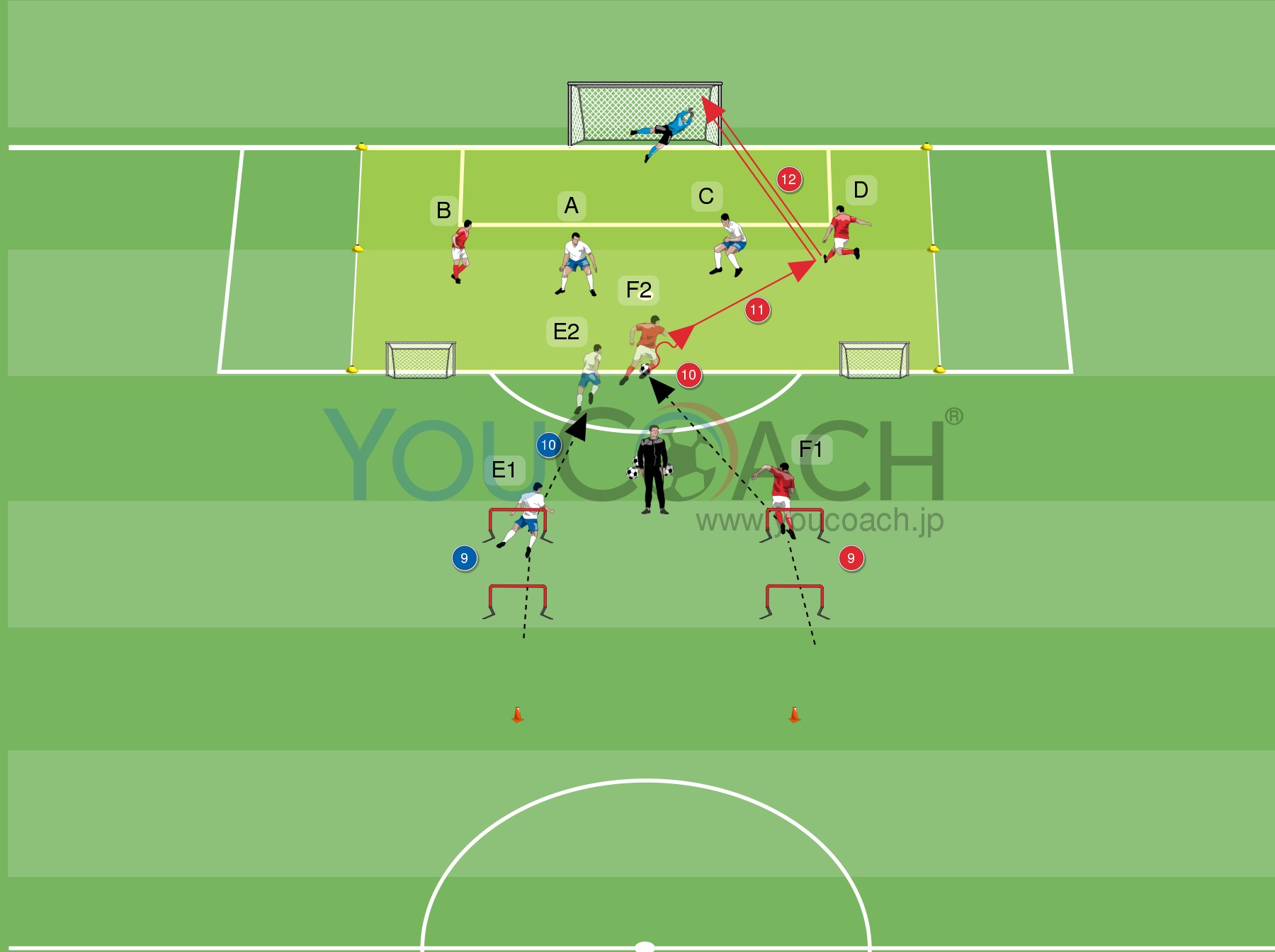 - F2の状況では、ボールを取れたFはオフェンス(BとDと協力)となります。E2の状況では、遅れてきたEはディフェンス(AとCと協力)となります。
