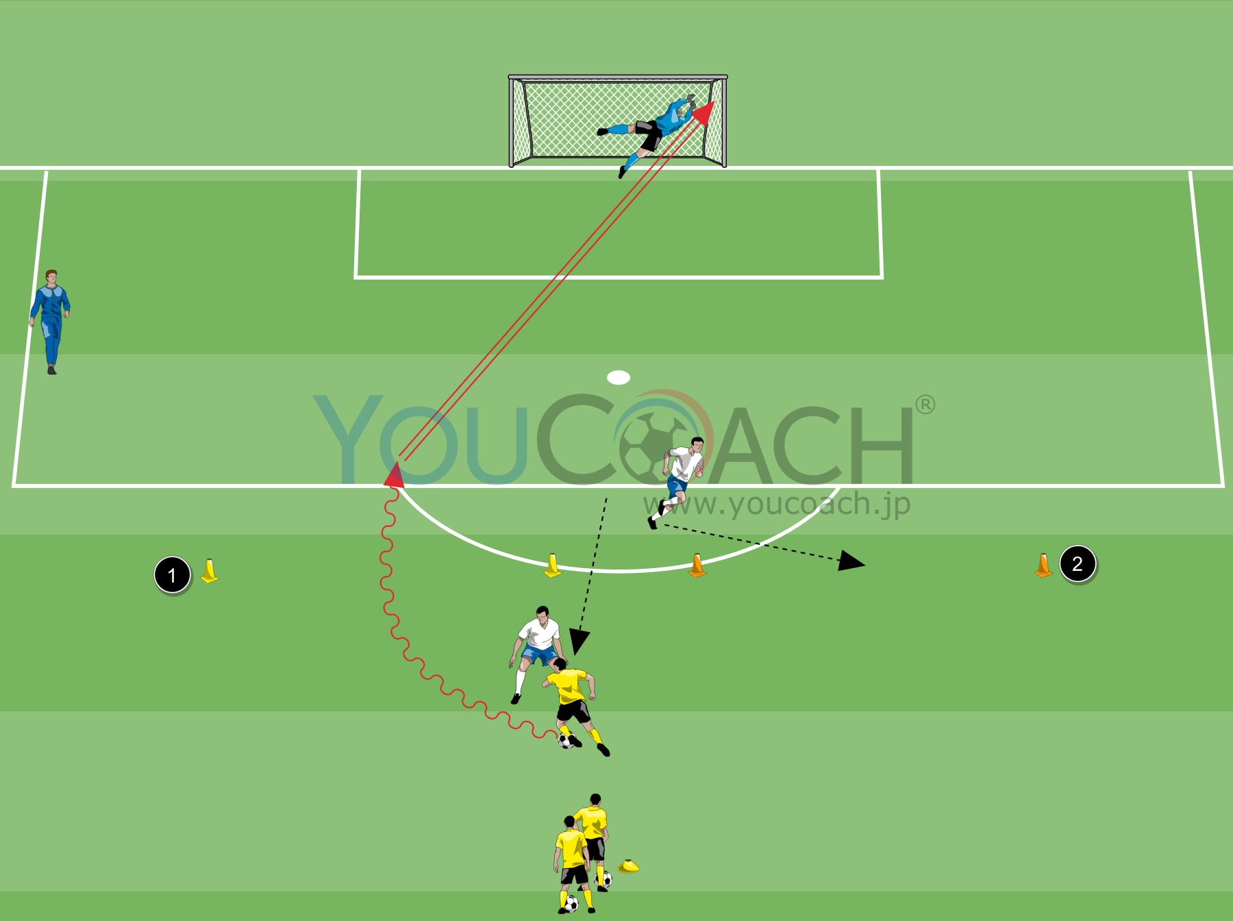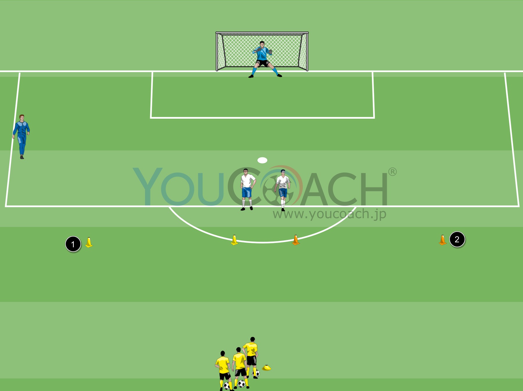 ペナルティエリアラインから5m先にコーンを4個置いていきます(黄色2個、赤色2個)。図のように2色間の間隔は5m、1色あたりの間隔は12m(図参照)。左側の黄色ゲートは1番、右側の赤色ゲートは2番とします。ゴールから35m先にスタート地点をセット。目印としてマーカーを1枚置いておきます。スタート地点にはプレーヤーはボールを持ってスタンバイ。ディフェンス役2名は2つのゲートの間に前後にスタンバイ。GKもトレーニングに加わります。