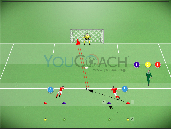 ペナルティエリアから5m先、ゴールポストの延長線上を基準に5×5mスクエアを4色マーカーで左右に2ヶ所作ります。2チームに分け、各スクエアに1名ずつスタンバイ。ペナルティアーク付近にはボールを1球おいて準備完了。