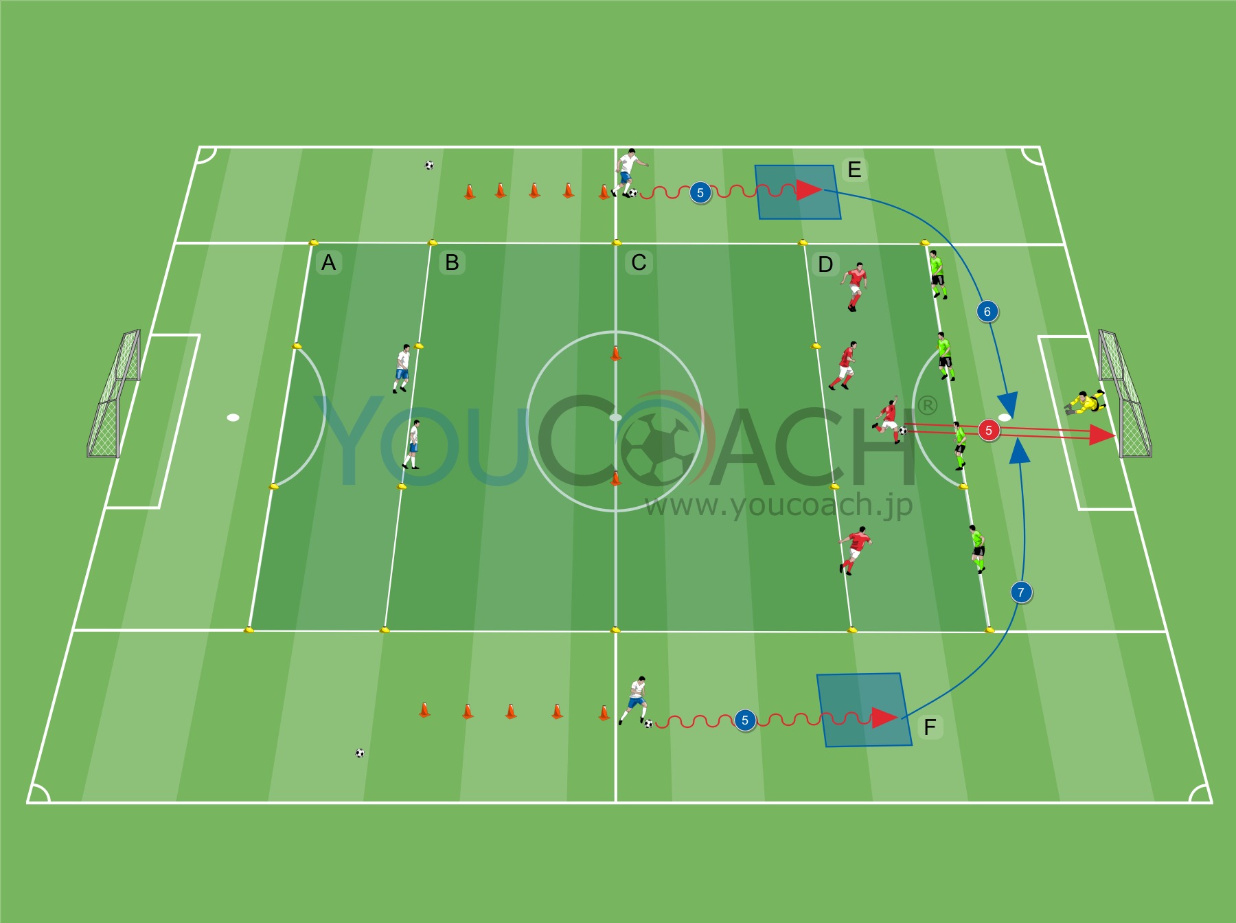 また、ある一定行ったら、ボールを中央のコーンの間を通してオフェンス側は攻撃を始め、4対4の状況を作る。それと同時に攻撃をしないチーム(図ではビブスなし)のプレイヤー2人がコーンが設置してある所に行き、マーカをドリブルでジグザグにかわして7−10メートル、ドリブルし4対4が行われているペナルティーエリアに向かって最初は左からクロスをあげる。