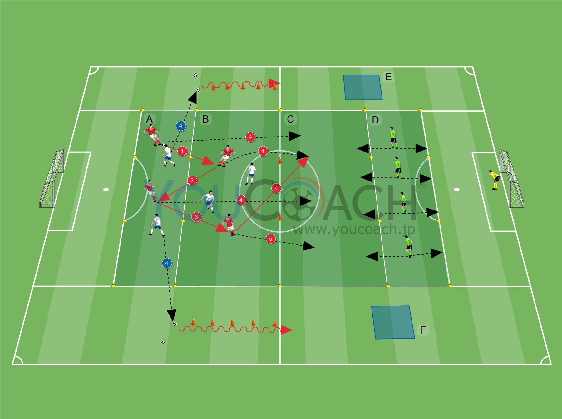 前からと横からのデフェンスラインへの素早いパス回し、ボールポゼッション、プレッシング、4対4 |