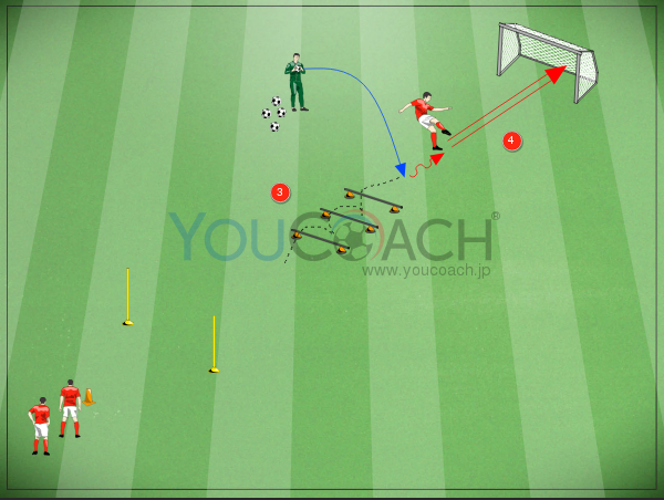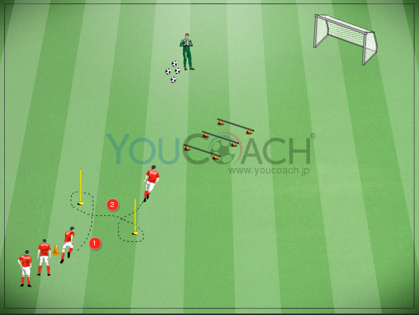 スタート地点から10mの距離にポール2本、5m離して1m間隔でハードル3個。 スタート地点から25mの距離にミニゴール。 コーチはハードルゾーンとミニゴールの間にボールを置いてスタンバイ。