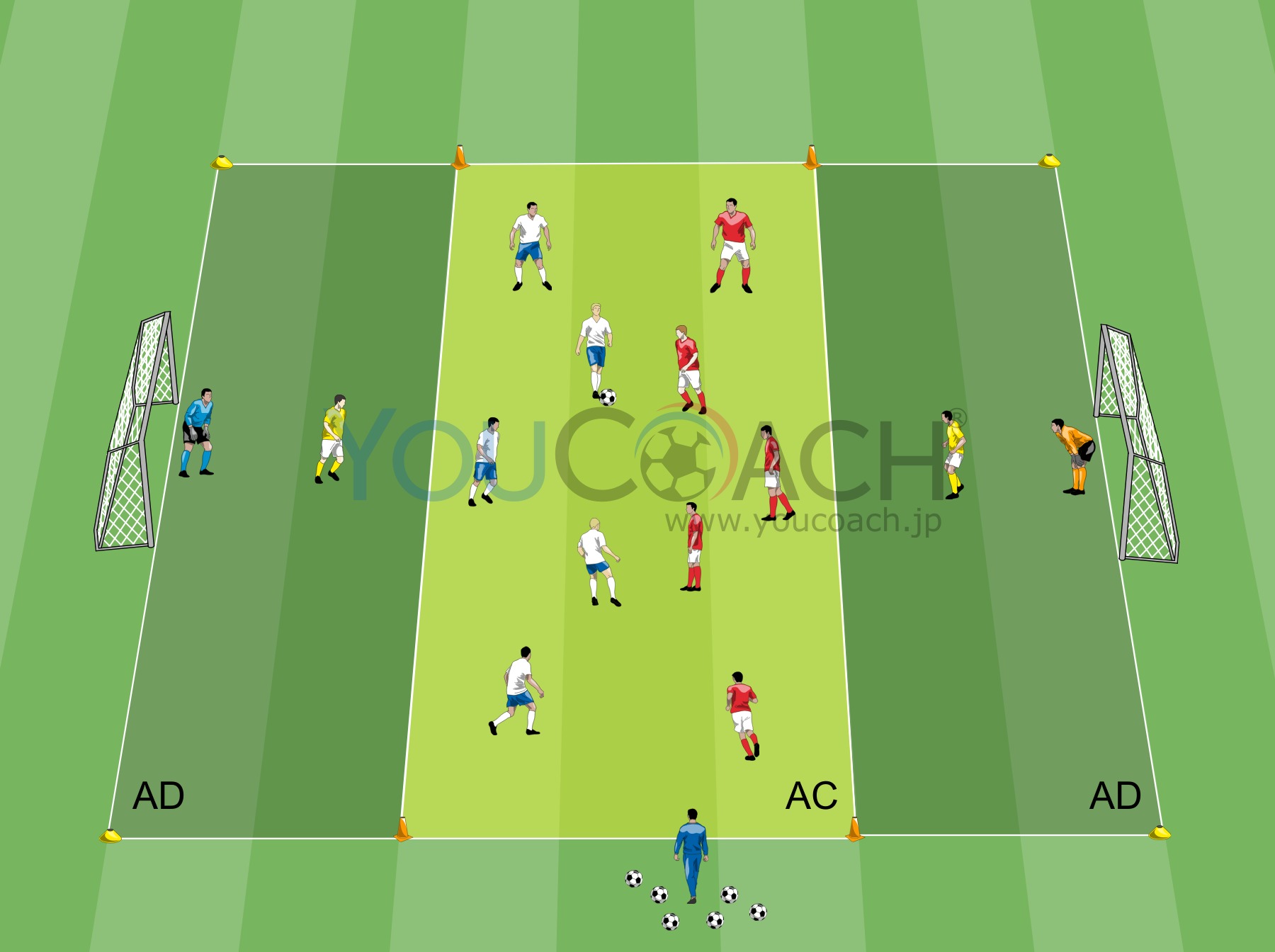 まずマーカーを使用して55x35mの長方形ピッチを作ります。短い方のラインにはゴールを1ヶ所ずつ、長方形の中央には25x35mのゾーンを4つのコーンで区切りACとします。1チーム5人制で赤と青の計2チームに分け、中央のゾーンにスタンバイ。GKを除いた残り2名はゴール付近のゾーンADにディフェンス役として1名ずつスタンバイ。
