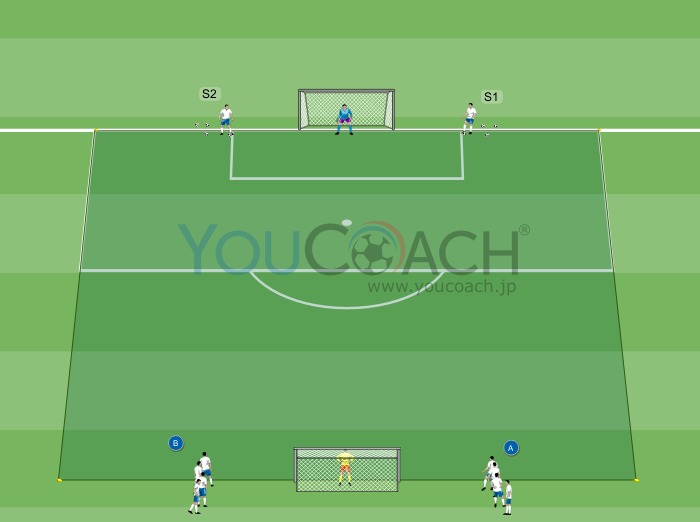 40x40mサイズのピッチにゴールを2ヶ所配置。図のように左右AとBのグループに分けて、プレーヤーは1列に並びます。AとBの反対側にはパサー役のS1とS2がボールを持ってスタンバイ。