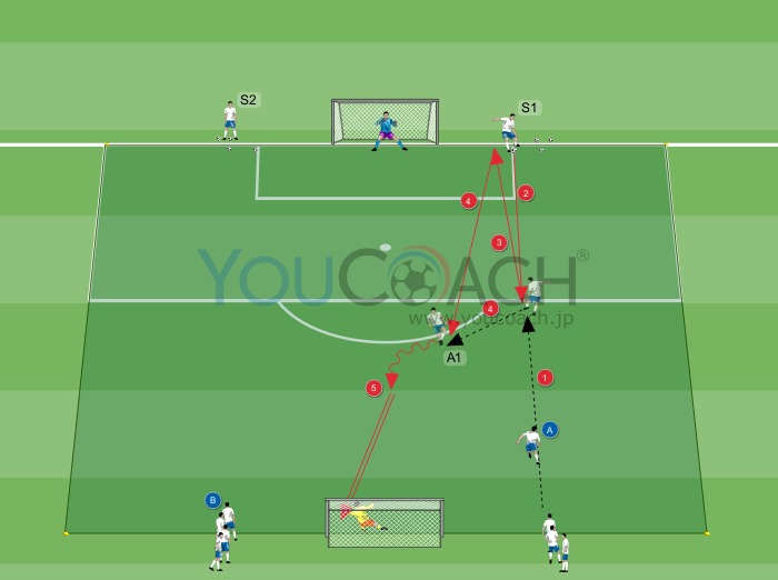 - S1はワンタッチでA1のスペースに走ったAにパスを戻します。