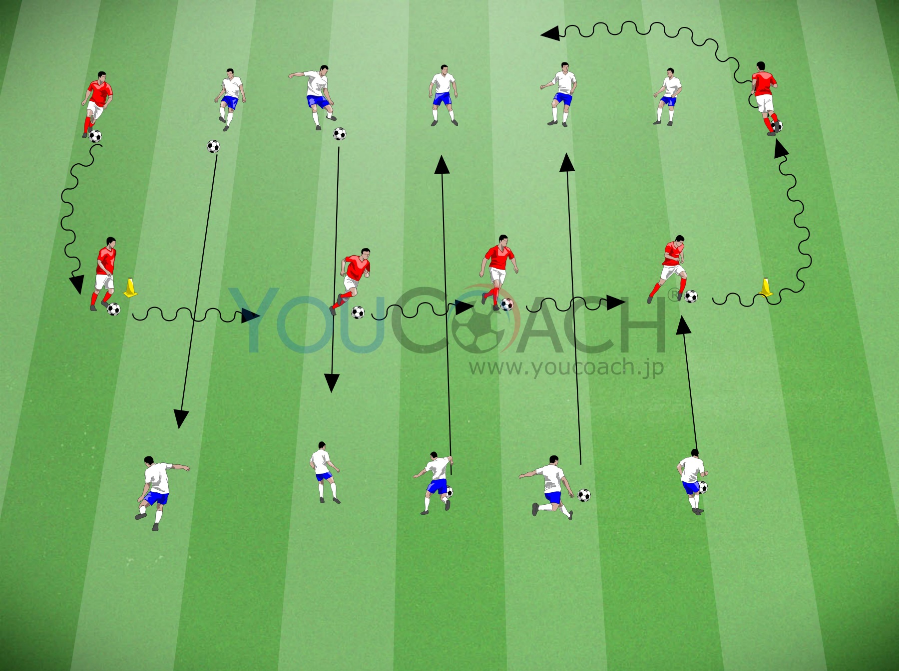 - このトレーニングはマーカーの距離を変えたりしながら、距離が広くなればなるほど難易度は上昇しますが、様々なカテゴリーで行うことができます。
