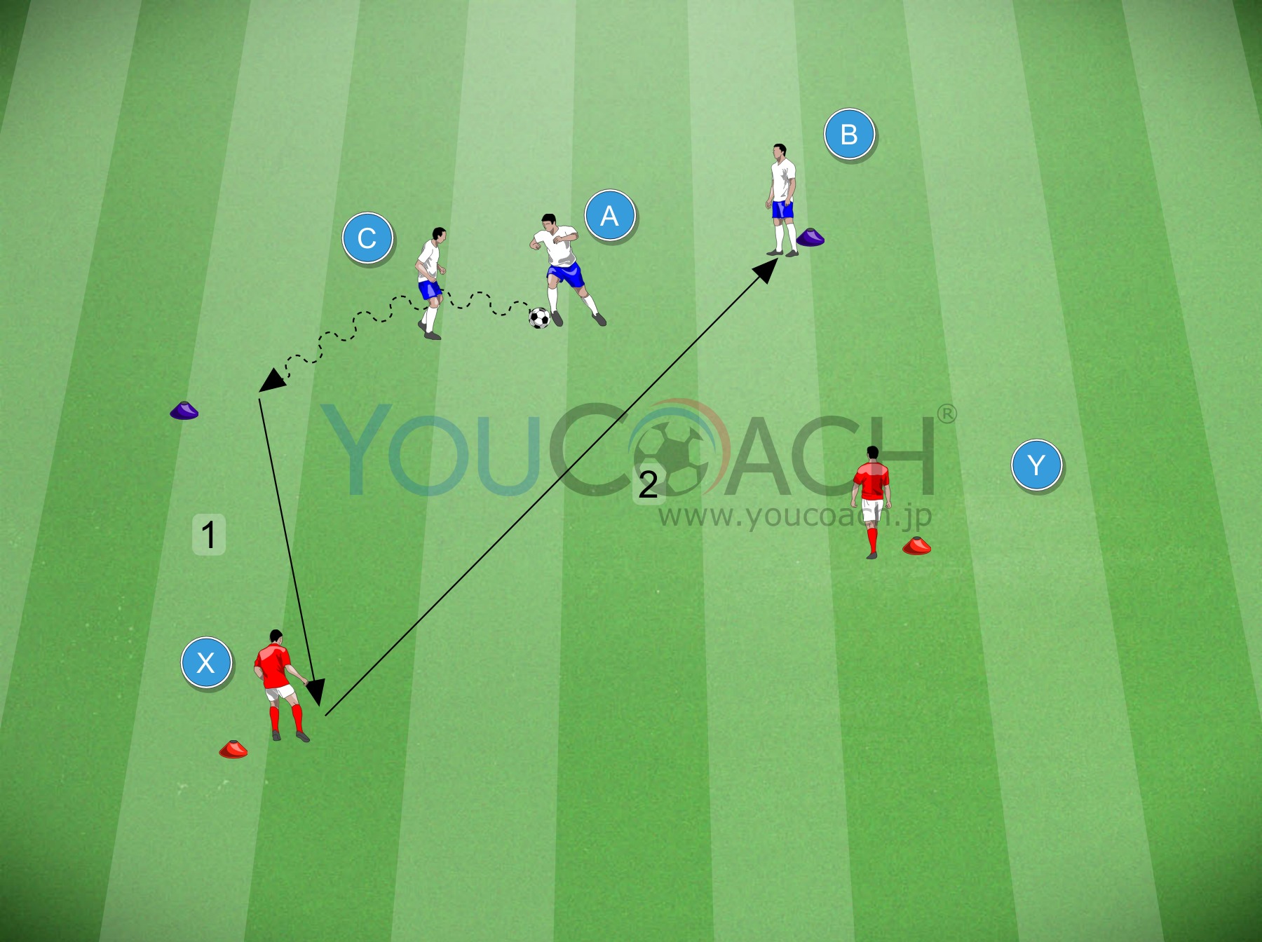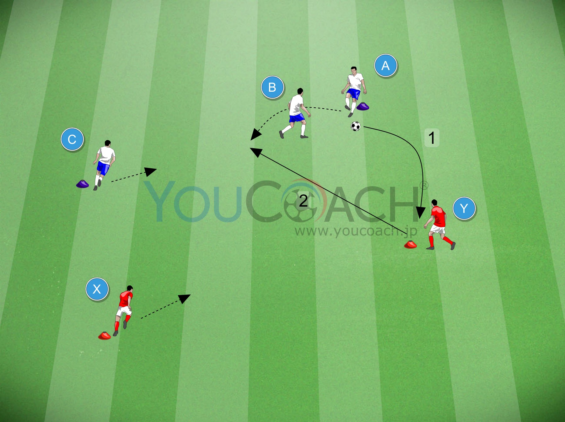- Aが、Bを越えるように、Yへ直接パスを狙うところからトレーニング開始