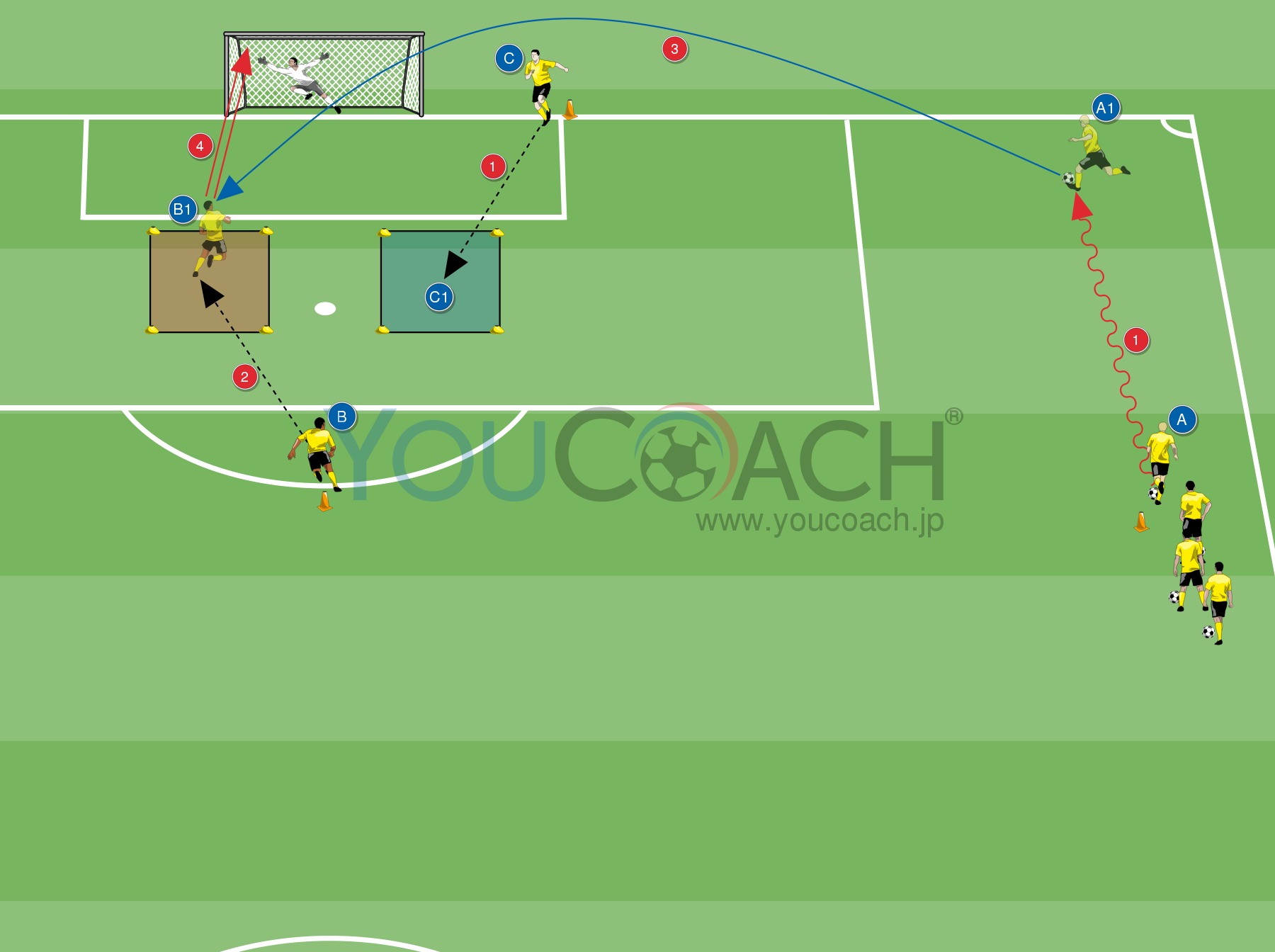 - クロッサーAは右サイド深い位置までボールドリブル開始。その間ディフェンスCは、ゴール前に2ヶ所配置されているミニスクエアどちらか1ヶ所に入ります。