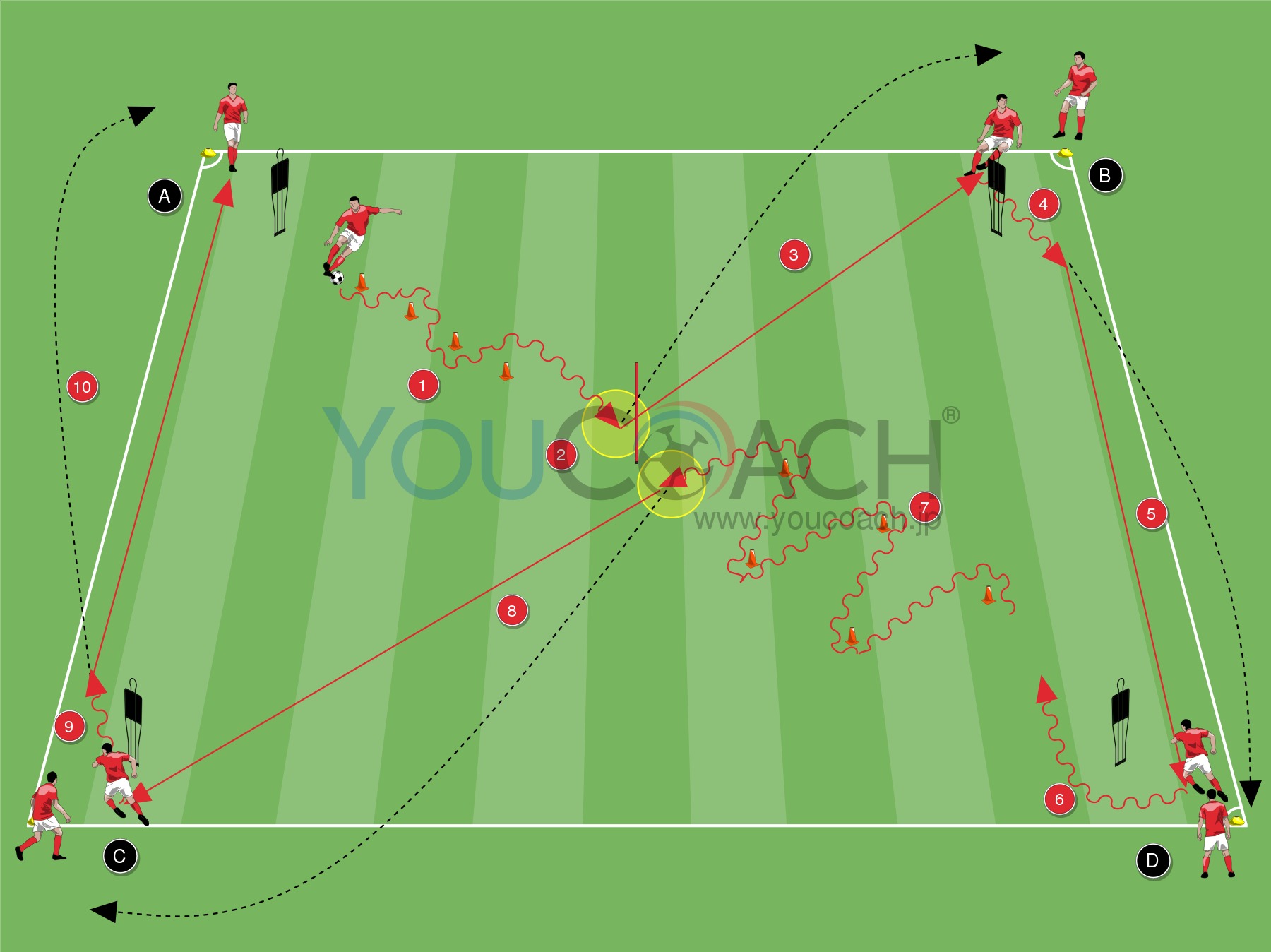 四角のダイアゴナルに9つコーンを置き、真ん中のポールの前に4つ、後ろに5つの様に配置する。始めの4つは等間隔に、他のコーンは違う距離で置く。コーンの前にいる始めの選手、A,Cは同時にスタートする。