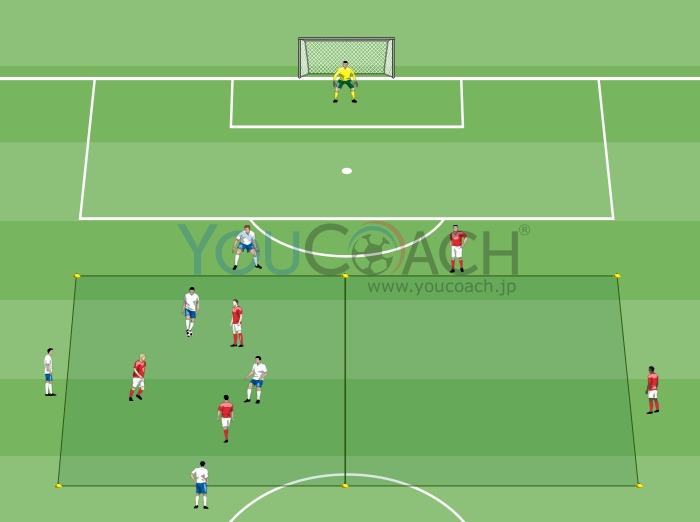 トレーニングに使用するエリアは、およそ11人制のコートの半面全部。ペナルティーエリアから約10mの所に、マーカーを使い、20×20mのグリッドを2つ用意する。プレーヤーは1チーム5人で、2チーム作る。グリッドの中には、5人(白2人、赤3人)のプレーヤーが入り、グリッドの3つの辺の外にはそれぞれ白のプレーヤーを配置。また、もう一つのグリッドの外側の辺とゴールに近い辺にそれぞれ赤のプレーヤーを配置。ボールは白チーム。ゴールキーパーはゴールを守る。
