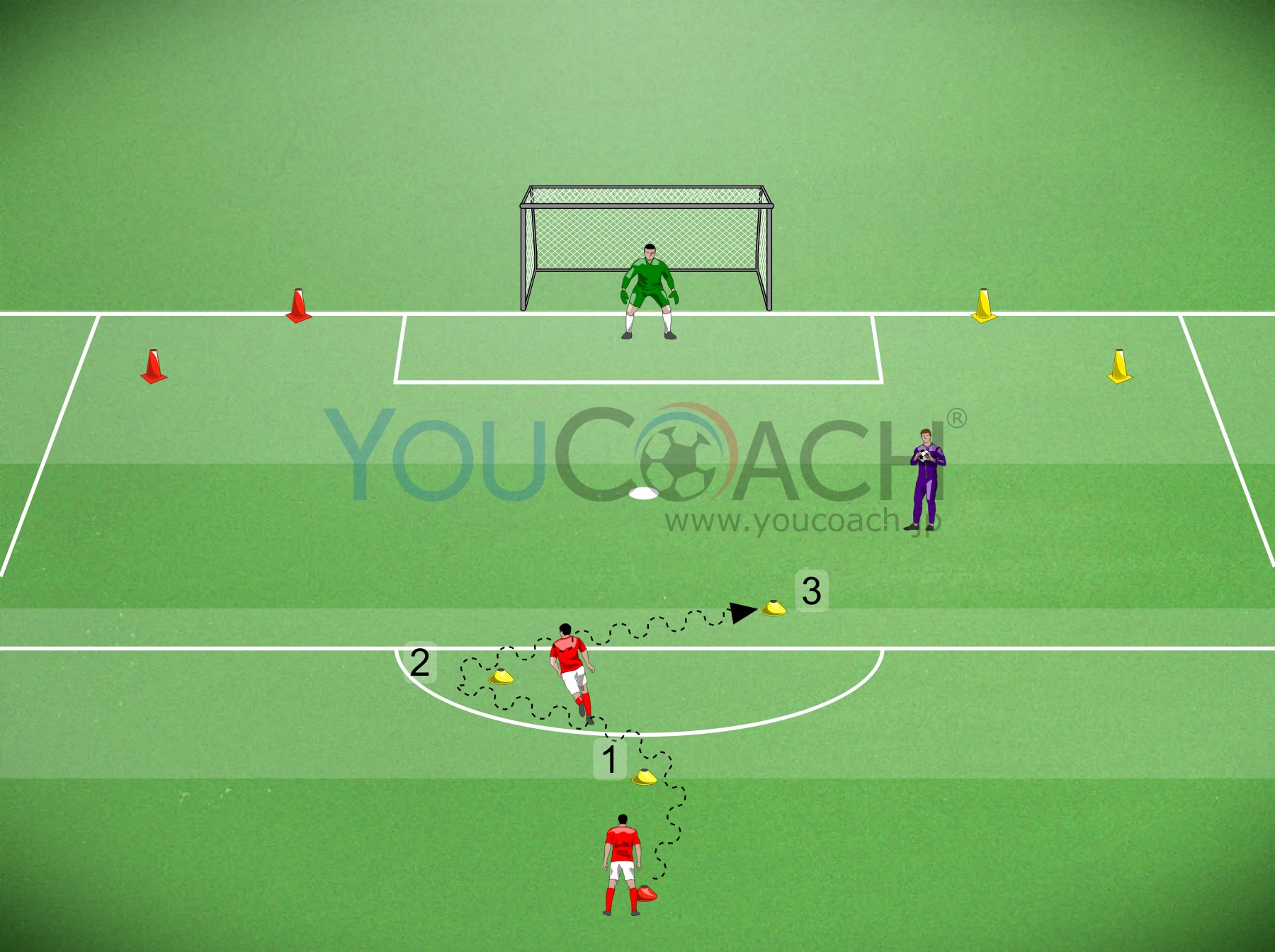 - マーカーの三角形から抜けたら、コーチからボールをうけて、そのボールをコントロールし先ほど指示を受けたゴールへシュートする