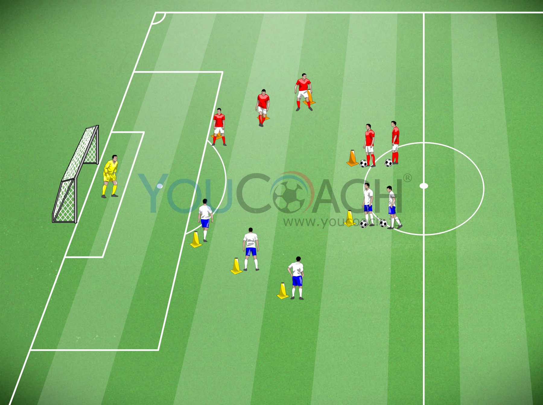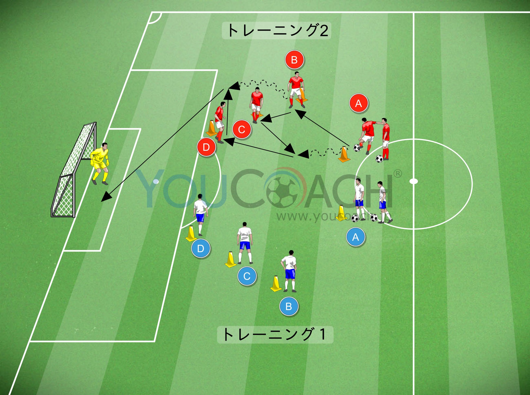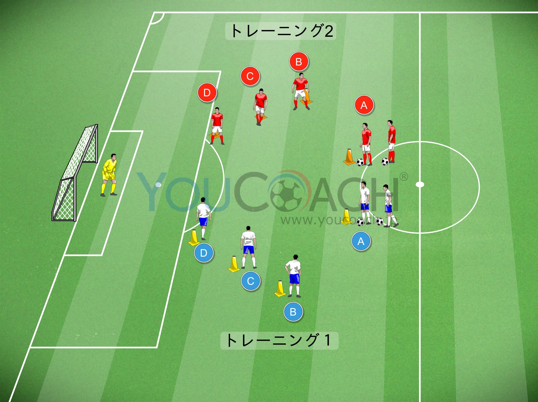 ポールとプレイヤーを最初の図のように配置します。このトレーニングではプレイヤーはアルファベット順(A,B,C…)に毎回ポジションを変えながらやります。片側からスタートし、毎回交互に行います(両側からやらなければいけません)。トレーニング1とトレーニング2、2つのバリエーションを片側ずつ行います。