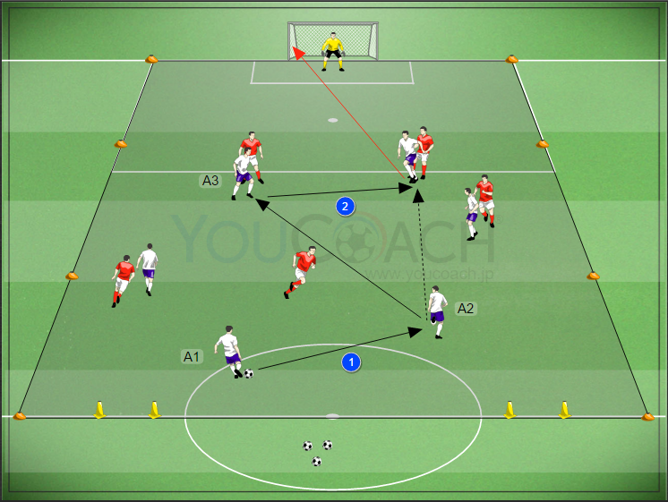 - A2 は、A3と壁パスをし、シュートのチャンスを狙います。