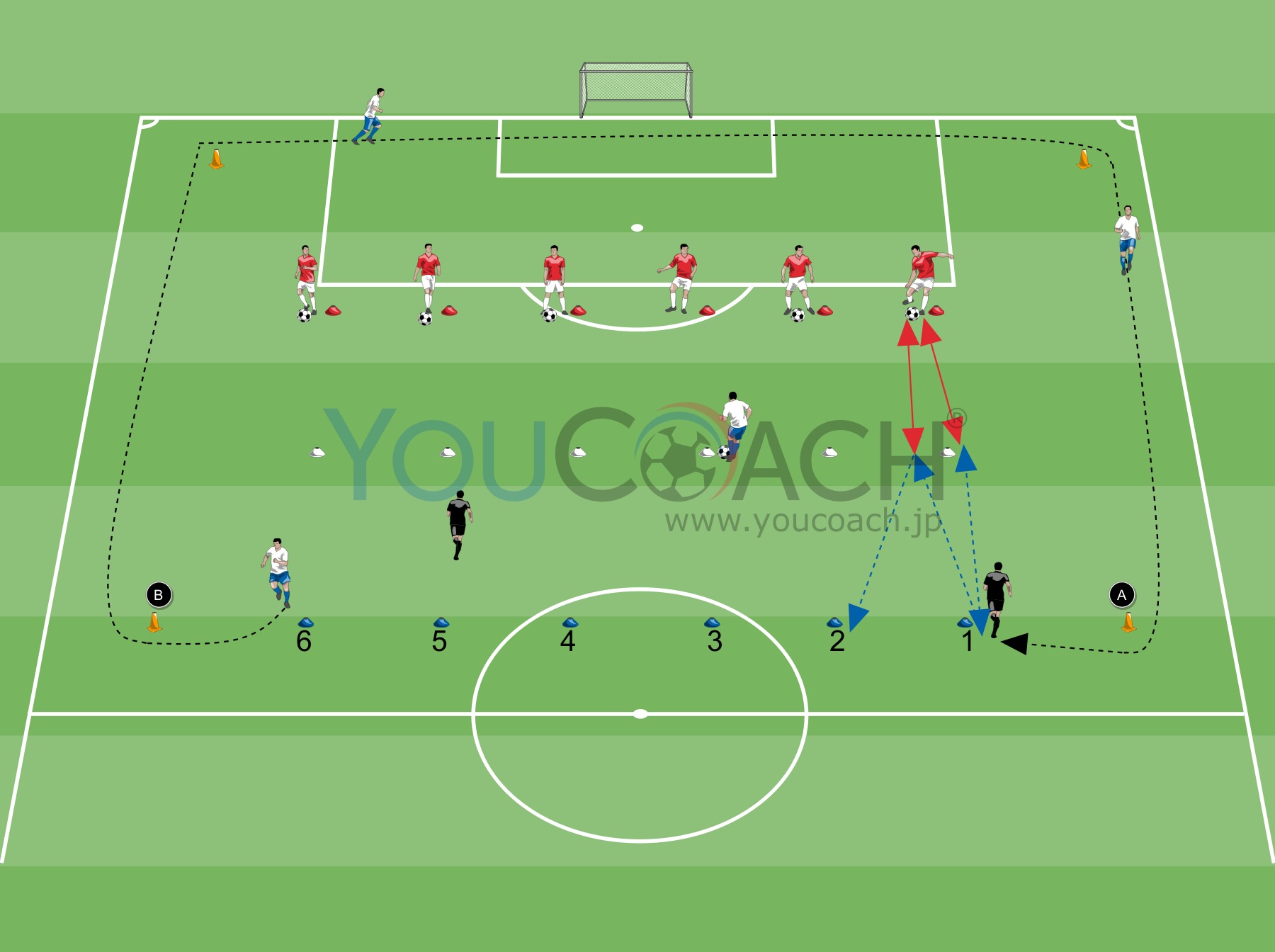 - 白色のプレイヤーはワンタッチでボールを戻し、反転をして、スタート位置(青色のマーカー)へ戻る。