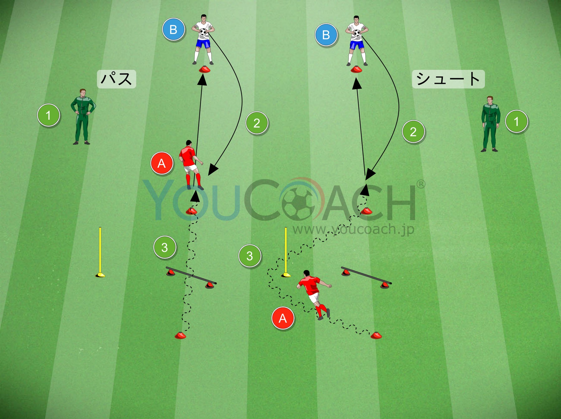 - Bはだいたい2つ目のマーカーをめがけて、手でAへパスを出します。