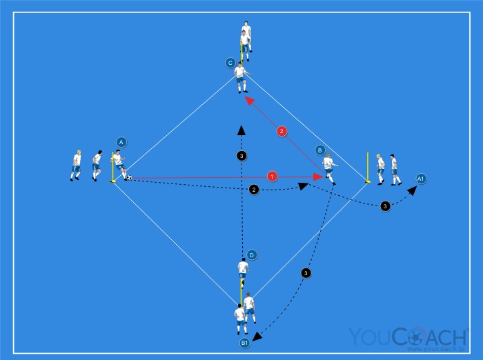 ポール4本を使用して距離が10メートルになるようにひし形を作る。プレイヤーを3人1組4グループ(A,B,C,D)へ分けて、どのグループもポールの横に配置する。Aグループの最初のプレイヤーがボールを持ってスタート。