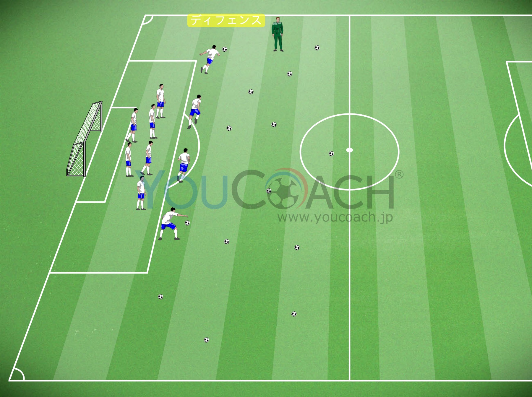 コートの半面のなかにいくつかボールを配置します。プレイヤーをポジションごと(ディフェンス、ミッドフィルダー、オフェンス)に、選択したシステム(図では4-4-2を採用)に合わせて、ペナルティーエリアの辺りに配置します。