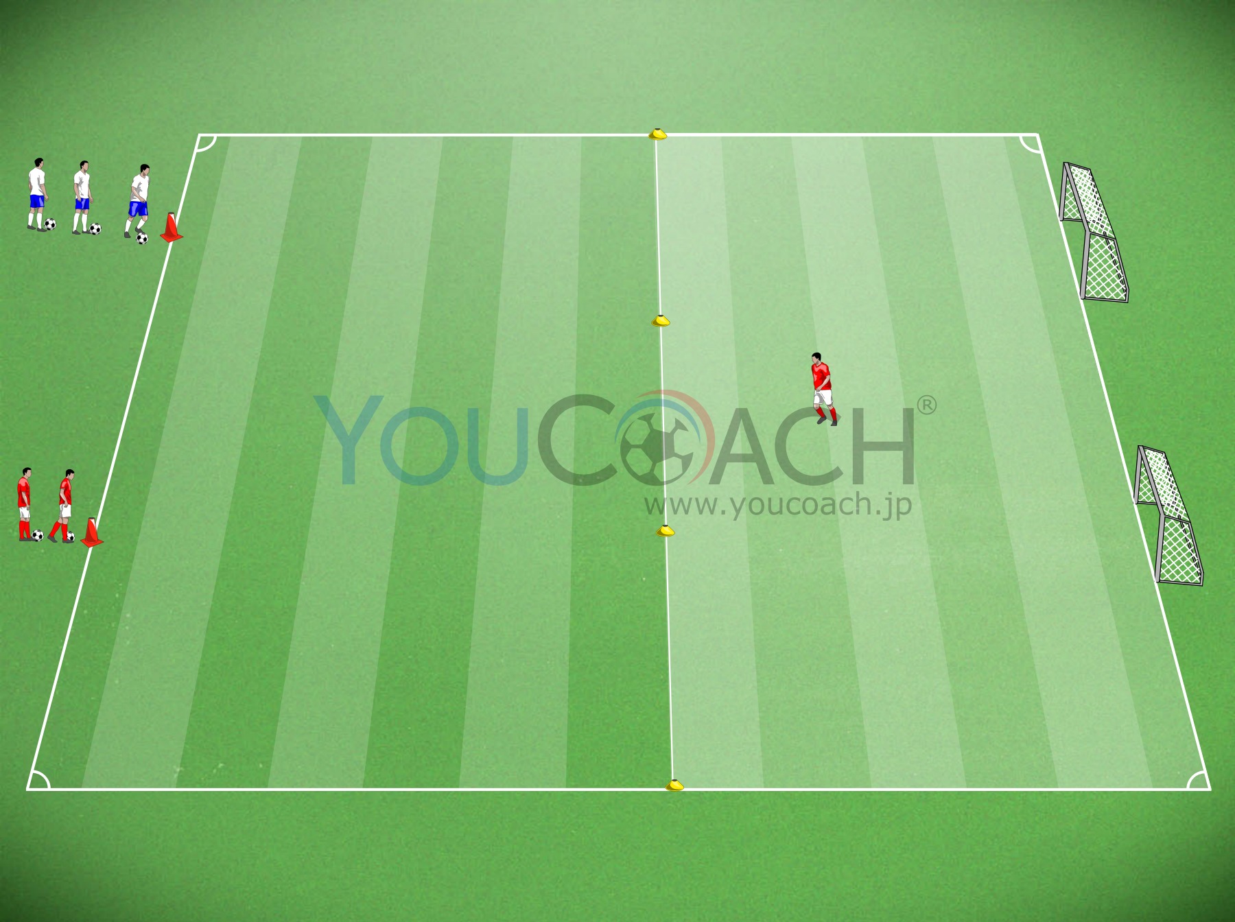 20×20mのピッチをマーカーで作ります。そのピッチの間に7×20mのエリアをマーカーで区切り、ミニゴールを10m間隔で2ヶ所セット。7×20mエリアの中にはディフェンス1人スタンバイ。ミニゴールの反対側にはスタート地点2ヶ所をコーン2個で作ります。オフェンス側はボール1人1球持ったら準備完了。
