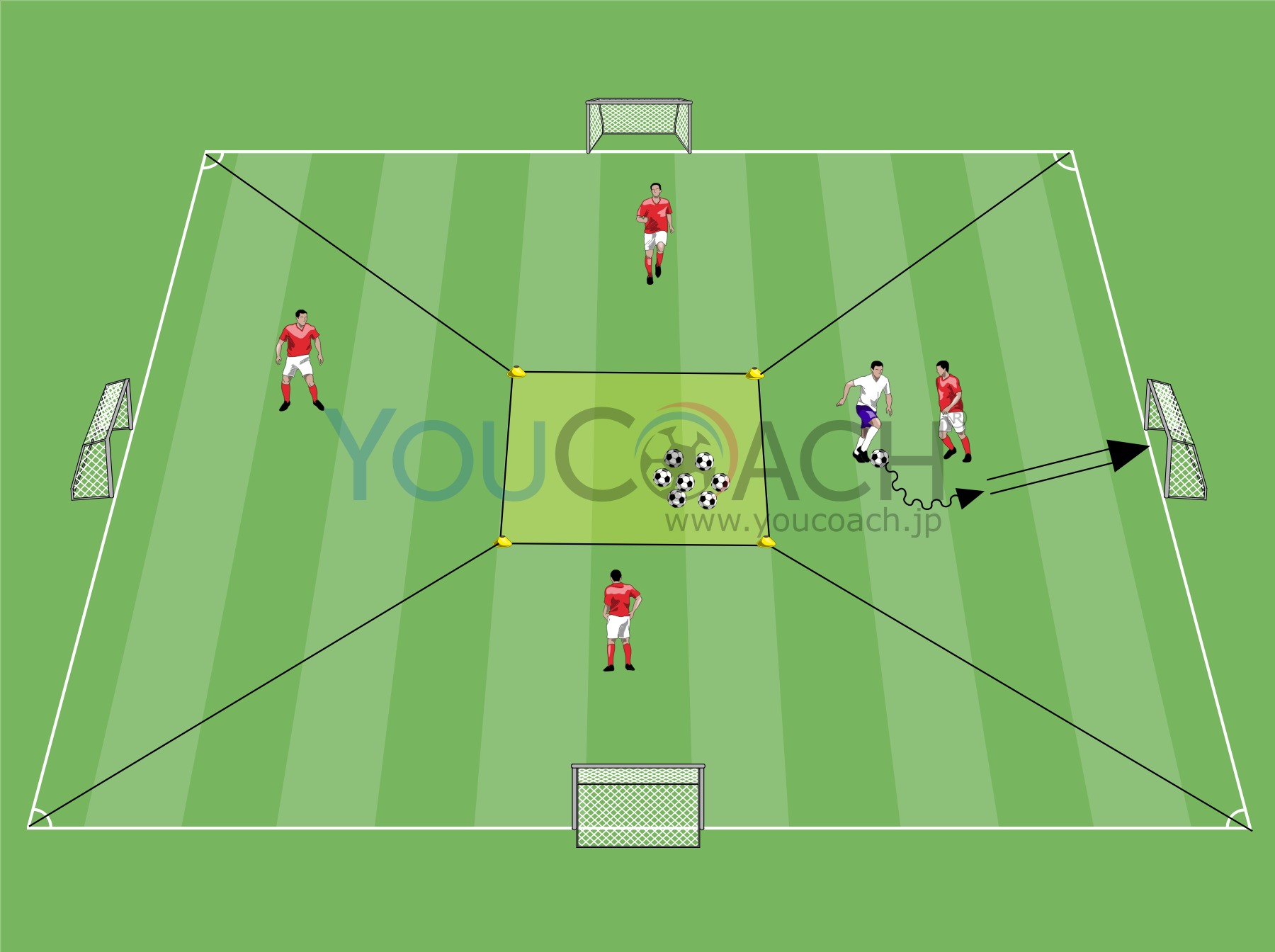 ピッチ中央には1m四方のミニスクエアを準備。ミニスクエアを囲うようにして7m四方のスクエアを作ります。図のように4つの台形ゾーンができるので、各ゾーンにミニゴールと、ディフェンスを1名ずつスタンバイ。中央のミニスクエアはオフェンス1名とボールを複数準備。