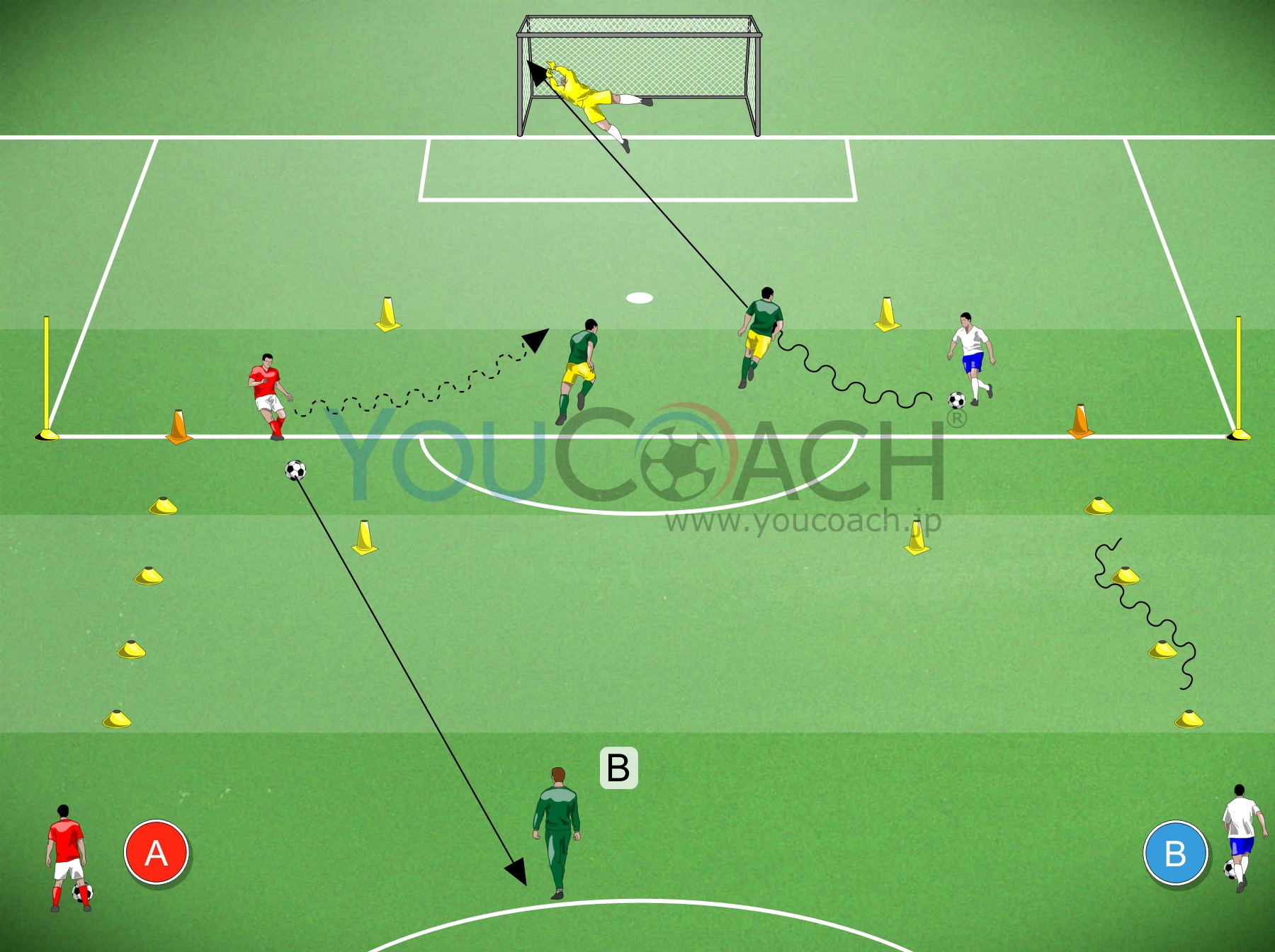 - コーチに選ばれた列のプレイヤー(”B”)はドリブルで侵入し、反対側の列の味方とディフェンス2人とで2対2を作り上げながら、フィニッシュを目指す
