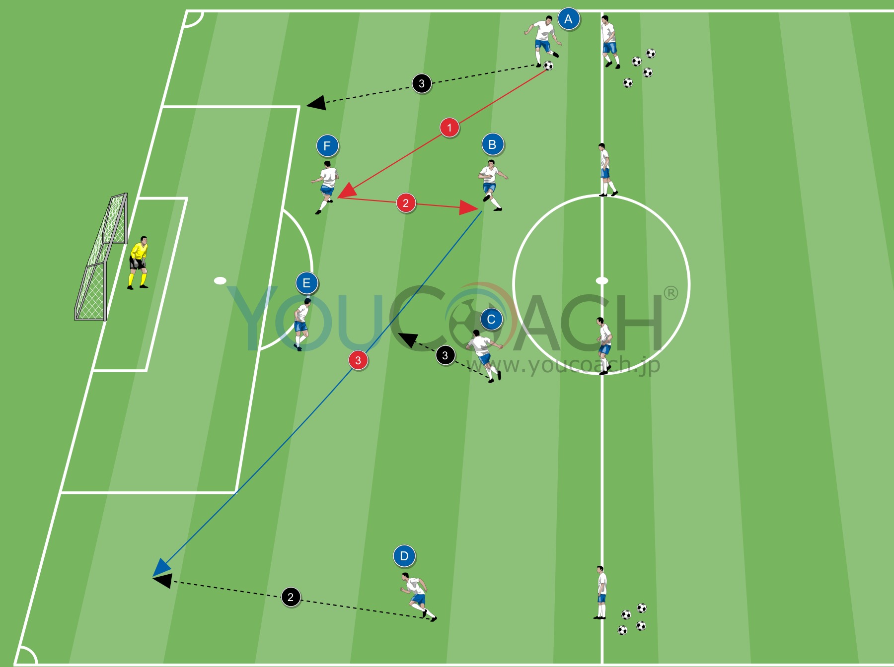 - Dはトラップしてから左サイド奥深くまで運ぶドリブル。一方でペナルティエリア内ではEとFが交差する動きでポジションチェンジ、Aはファーサイドまで前進。