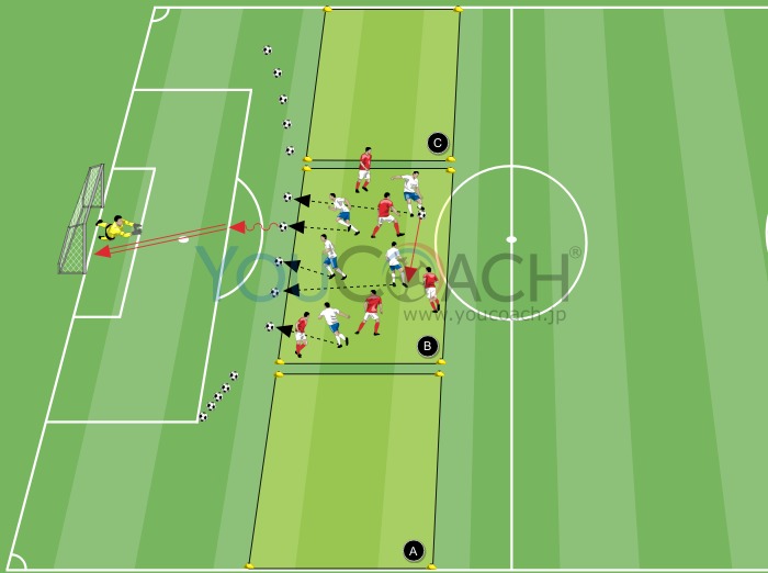 タッチ数制限のポゼッションと、複数のポジションからのシュートを行う条件付き試合形式トレーニングです |