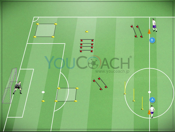 ハーフピッチ内にマテリアルを配置していきます。センターサークル付近Aのポジションにスタート地点と、1m50cm間隔でポール3本セットし、スラロームを作ります。スラロームの3m先にはハードルを2個、ペナルティエリアのライン際には5x5mのミニスクエアを設置。ペナルティマーク横にはマーカーを1枚。センターサークルの右側にはスタート地点と、5m先にミニハードル2個、さらに5m先にマーカー1枚、マーカーの左側には図の通り、ハードルを5個並べます。右サイド深い位置には10x10mサイズのスクエアを配置したらマテリアルの準備完了。スタート地点AとBにプレーヤーを振り分け、Aはボールを1人1球ずつ持ってスタンバイ。