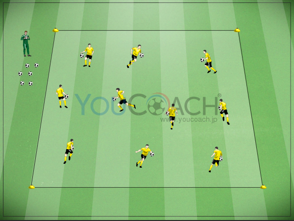 15x15mのスクエアをマーカーで準備します。スクエア内ではボール1人1球持って全プレーヤースタンバイ。