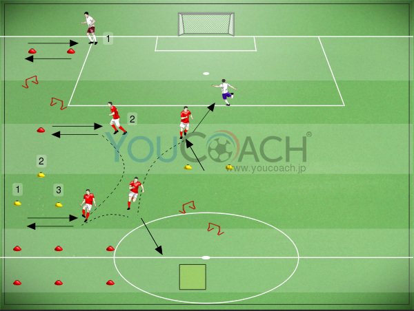 ・パス交換したら2のプレーヤーはゴール方向に向けてスルーパス。