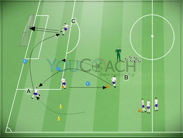 6. ロングパスを受けたAはトラップの後、ペナルティエリア中央付近にクロス。この時BとCはクロスを受けてからフィニッシュに持ち込むためにペナルティエリア内に走ります。
