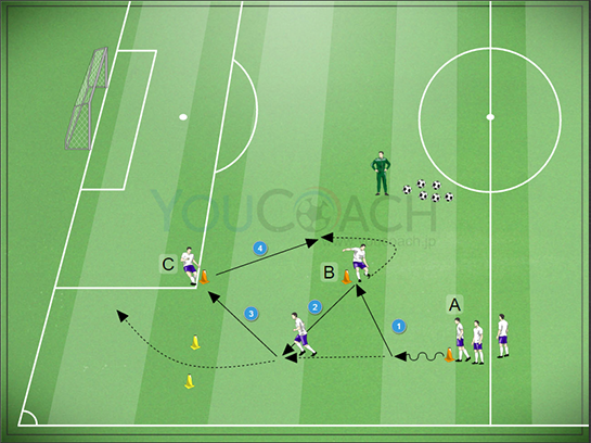 サイド深い位置への突破までの一連の動きの習得に効果的なトレーニングです