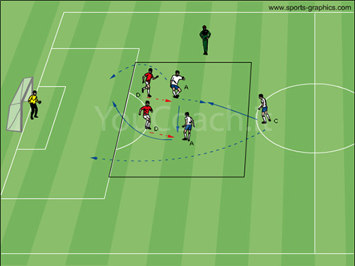 ペナルティーエリアの前に作られたグリッドの中にプレーヤーを配置します。プレーヤーを2チームに分け、ディフェンス2人をD、オフェンス2人をA、そしてミッドフィルダーをCと呼ぶ。