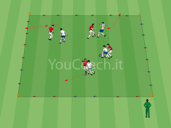 - Il giocatore in possesso del pallone svolge il ruolo dell'attaccante mentre l'altro difende. Si creano delle situazioni di 1 contro 1.