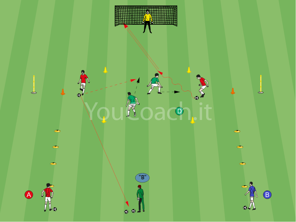 - Il giocatore della fila scelta dal mister ("B") entra in dribbling e cerca la conclusione a rete, ingaggiando un 2 vs 2 con i difensori e il compagno della fila opposta