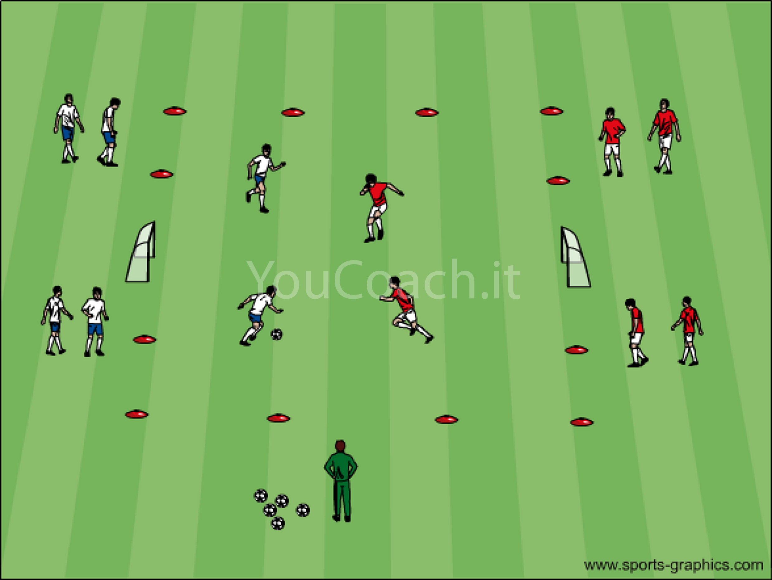 - Al primo turno, come da esempio, la squadra bianca inizierà il possesso di palla attaccando la porticina difesa dai rossi