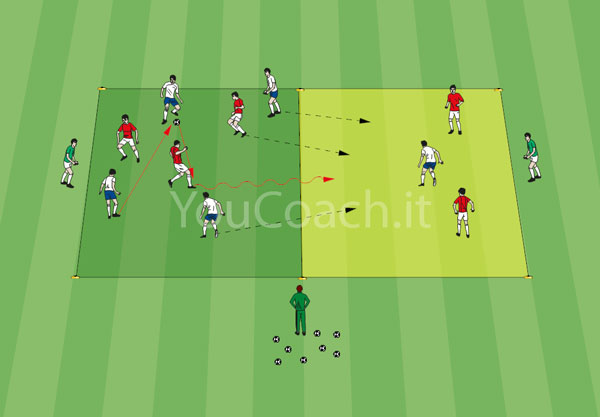 - Se durante il possesso palla la squadra in superiorità fa uscire il pallone dal quadrato di gioco, l'allenatore lancia un altro pallone all'interno dell'altro quadrato per far riprendere il gioco
