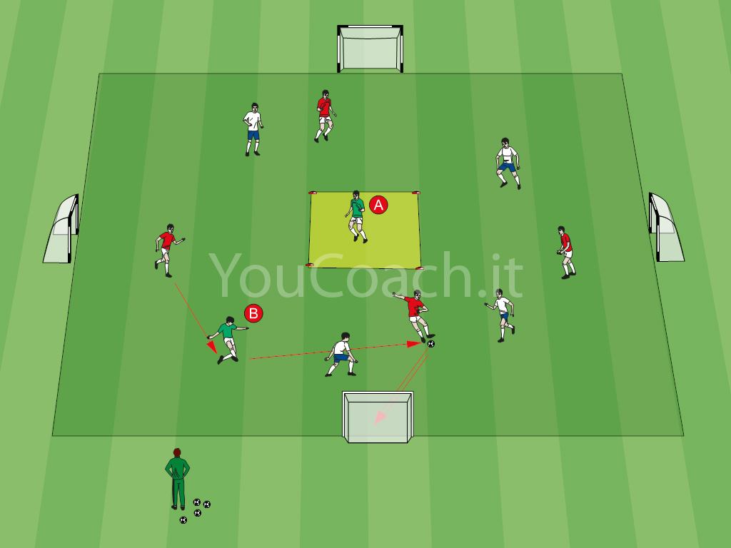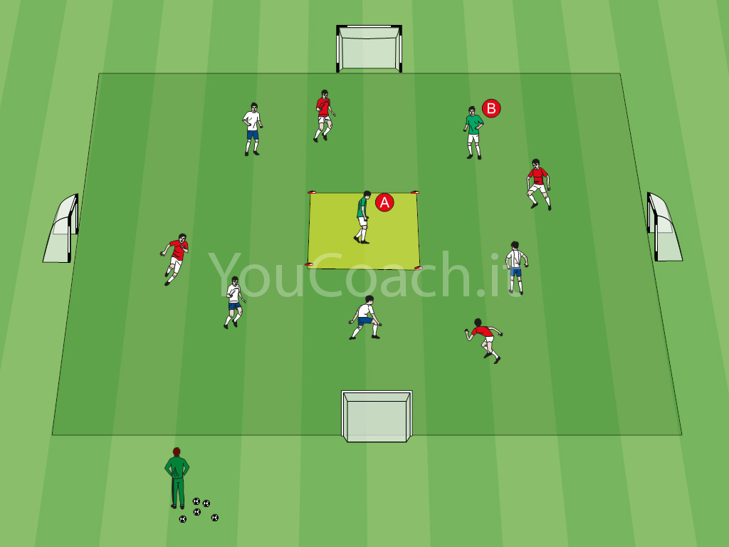 Delimitare, utilizzando i cinesini, un'area di gioco 20x20 metri. Per ogni lato del quadrato collocare 1 porta di piccole dimensioni. Al centro del quadrato creare una seconda area 5x5 metri. Suddividere i giocatori in 2 squadre di 4 giocatori più 2 jolly (A e B), utilizzando le casacche. Uno dei due giocatori jolly posizionato all'interno del quadrato 5x5 metri. Palloni all'allenatore, posto al di fuori dell'area di gioco.