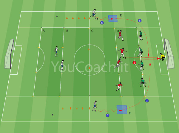 Al raggiungimento del numero di passaggi prestabilito la squadra in possesso di palla (nell'esempio in figura i rossi) conseguono un punto ed attaccheranno la linea difensiva verde in una situazione di 4 vs 4 con il primo passaggio che deve essere effettuato attraverso la porticina indicata dai coni arancioni. Nel frattempo due giocatori che hanno perso il confronto con gli avversari (due bianchi in questo caso) usciranno dal settore e troveranno ciascuno un pallone: effettueranno quindi il percorso tecnico conducendo la palla fino al rispettivo quadrato (E ed F) e dovranno effettuare il cross in area di rigore dove ci sarà sempre una situazione di 4 vs 4 su cross laterale prima da destra e poi da sinistra.