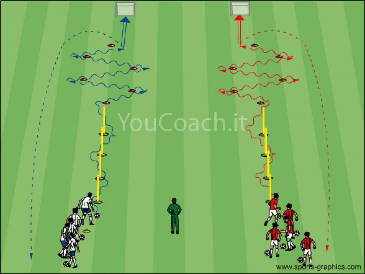 Disporre coni, paletti e cinesini in modo simmetrico come in figura. Posizionare i paletti a circa un metro di distanza tra loro. Posizionare i cinesini a circa un metro di distanza tra loro. Posizionare due porticine a circa 3 metri di distanza dall'ultimo cinesino. Due file di 6 giocatori ciascuna partono dietro al cinesino più in basso. Ogni giocatore ha il pallone.