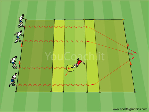 I giocatori senza casacca partono in guida palla e devono arrivare fino all’ultima linea di cinesini prima della quale calciano verso la porticina. Il difensore con la casacca (l’uomo nero) ha l’obiettivo di rubare il pallone dei compagni prima che questi arrivino all’ultima linea di cinesini.