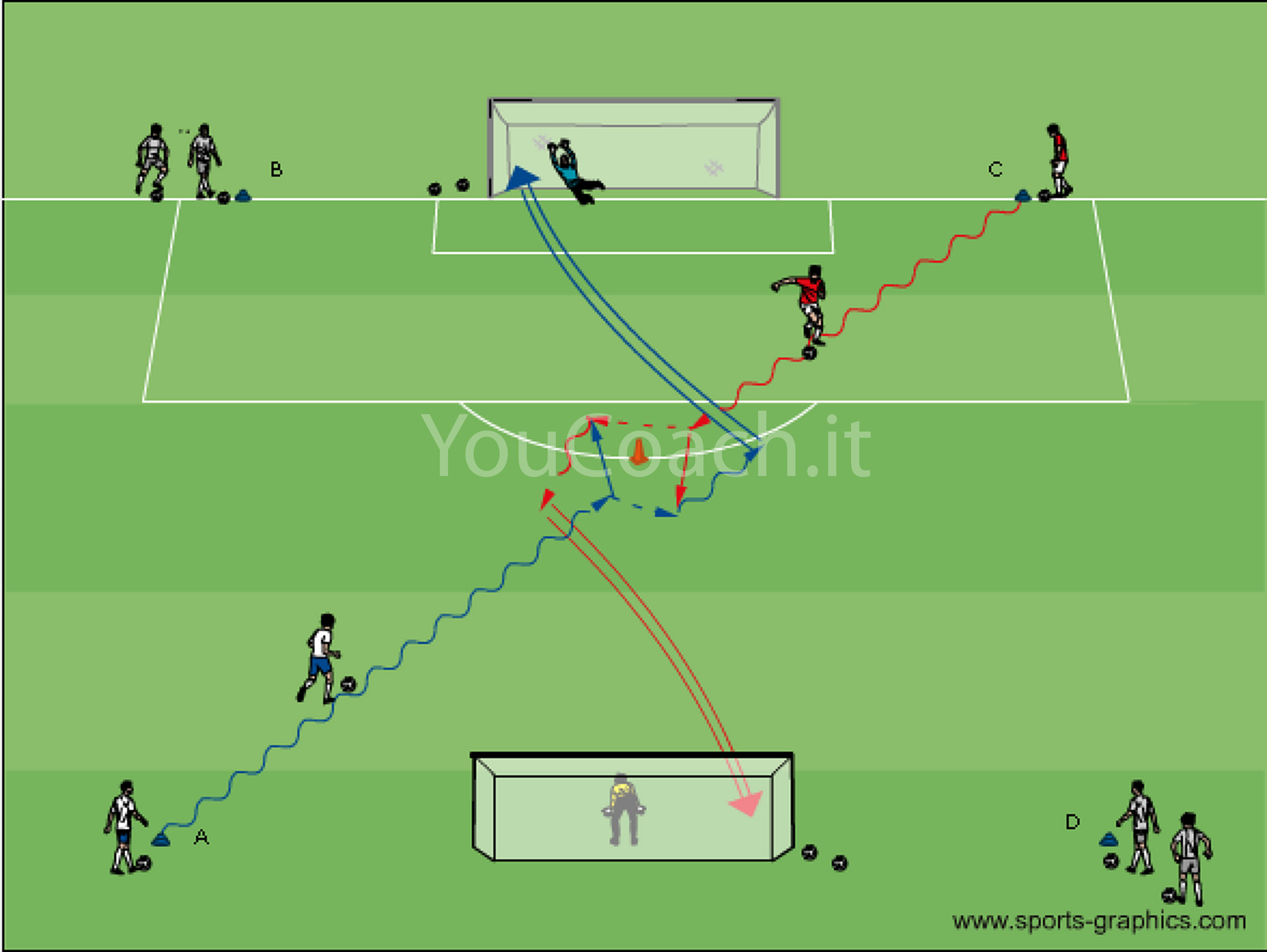 Posizionare le due porte a circa 30 metri l'una dall'altra. Il cono al centro indica il punto di scambio mentre i 4 cinesini indicano le posizioni di partenza. I portieri difendono una porta ciascuno. I giocatori si dispongono in numero uguale sui 4 cinesini. A turno dovranno cominciare l'esercizio da tutte le posizioni di partenza (A, B, C e D) per tirare dalle varie angolazioni.