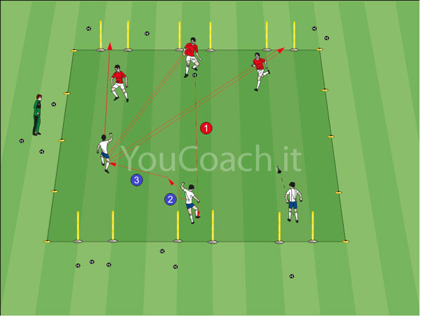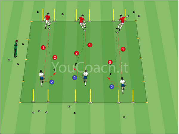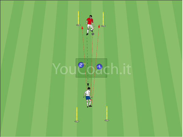 I giocatori lavorano in coppia e cambiano i ruoli continuamente. Entrambi i giocatori iniziano l'esercitazione dalle loro porticine. Il difensore serve un passaggio rasoterra e preciso (1) per l'attaccante e corre verso di lui per diminuire velocemente la distanza. Il difensore deve chiudere le linee di passaggio sulla propria porticina e deve correre verso l'attaccante finché non riceve palla. L'attaccante può cercare di fare goal direttamente nella porta del difensore. Quando il difensore chiude le linee di passaggio e l'attaccante riceve palla per il dribbling, il difensore deve attaccare l'attaccante sul lato del piede col quale porta avanti la palla (2). Il difensore deve cercare di portare l'attaccante a giocare col piede debole. L'attaccante deve cercare di superare il difensore in una situazione di 1 v 1 e deve cercare di fare goal nella porticina del difensore. Se il difensore recupera palla puó attaccare la porta dell'attaccante.