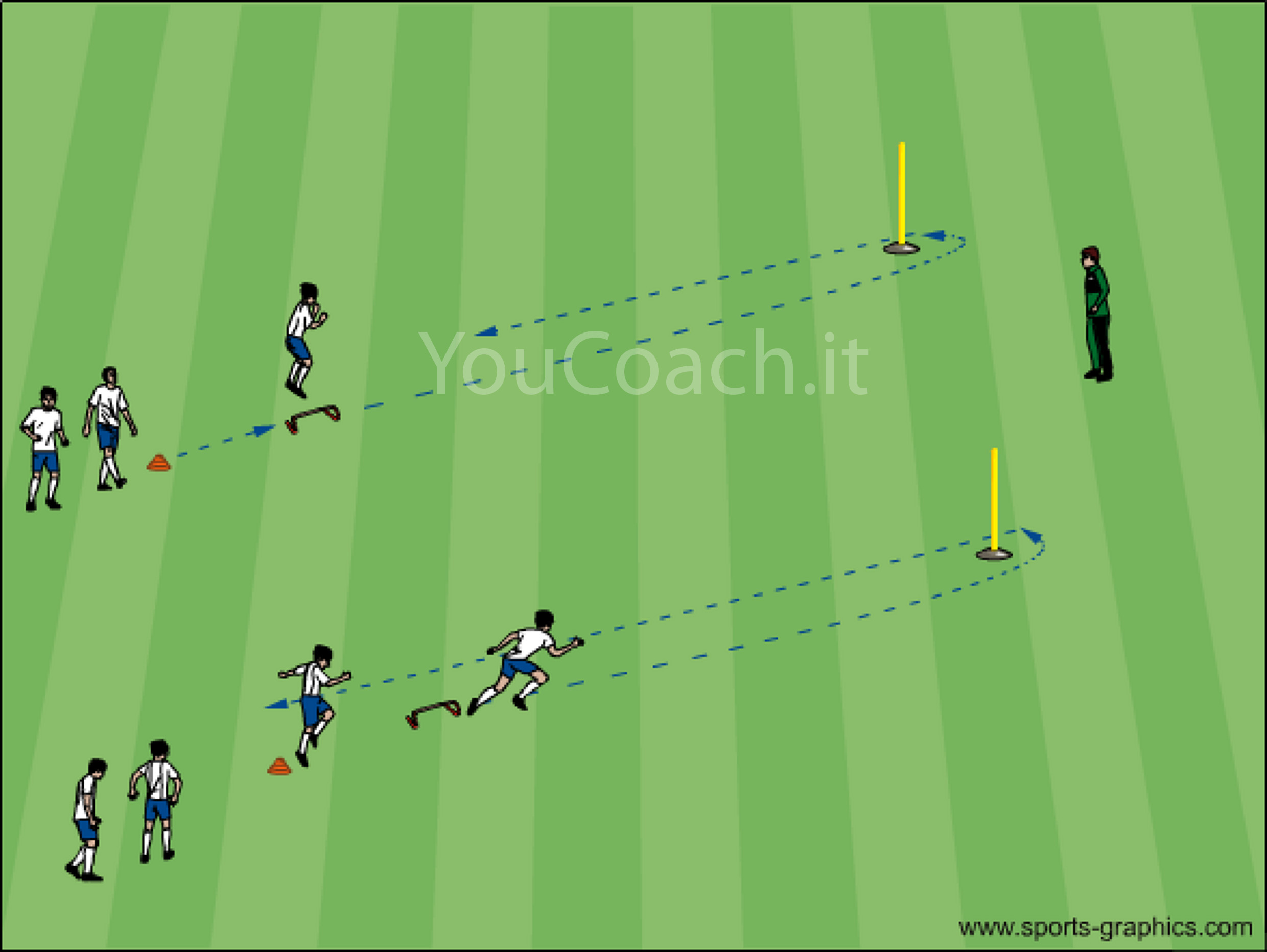 Posizionare il materiale in linea retta come in figura. Il paletto va posto a circa 15 metri dal cinesino di partenza. Disporre i giocatori su 2 o 3 file in base al tempo di recupero che si vuole concedere. Variare l'esercizio da effettuare sull'ostacolo ad ogni ripetizione.