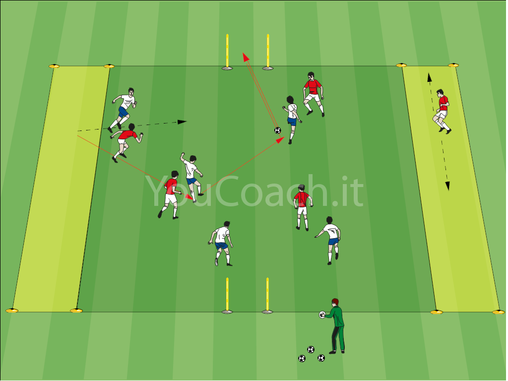 - Il gioco si sviluppa come un possesso palla 4 vs 4 all'interno del quadrato con finalizzazione sulle porticine