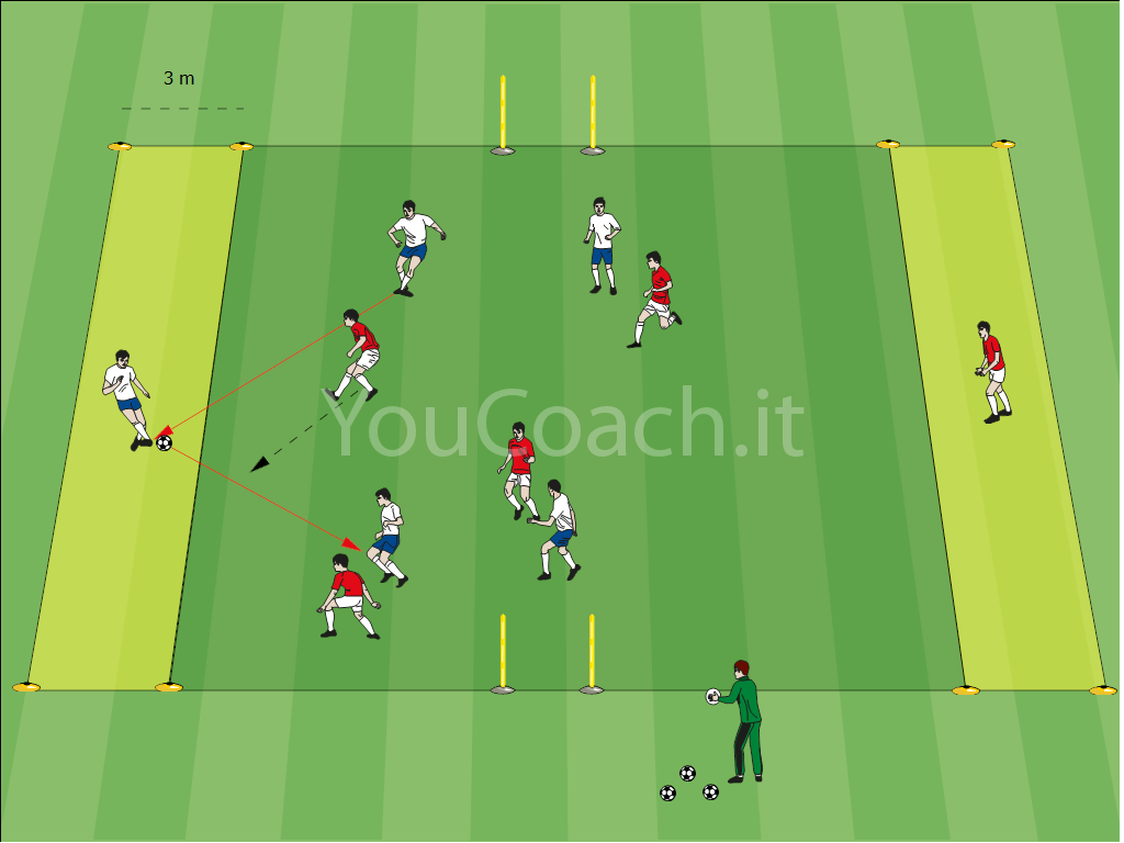 Formare un rettangolo di 21x15 metri con i cinesini. Delimitare due zone larghe circa 3 metri su ogni lato. Formare due porticine larghe circa 2 metri con i paletti a metà dei lati lunghi del rettangolo (come in figura). Dividere i giocatori in due squadre di 5 usando le casacche. 8 giocatori (4 per squadra) stazionano all'interno del quadrato centrale mentre un giocatore per squadra si posiziona nelle aree laterali.