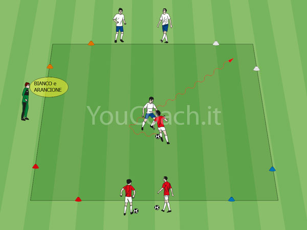 - I giocatori non in possesso palla, se la recuperano, devono fare gol nelle 2 porticine dei colori non chiamati dall'allenatore